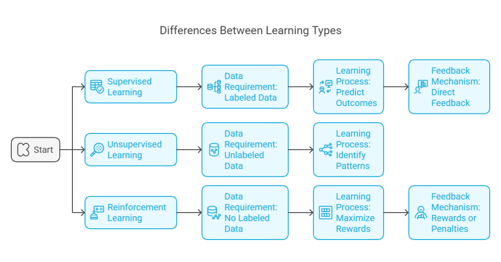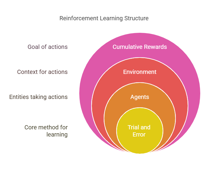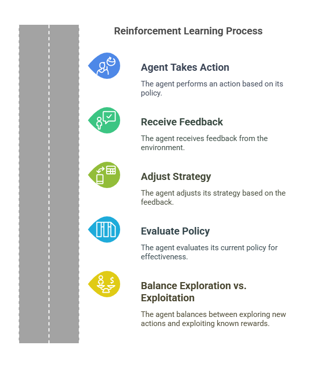 Reinforcement Learning operates on the principle of maximizing rewards through a feedback loop. The agent performs actions, receives rewards or penalties, and adjusts its strategy accordingly. This process is characterized by: